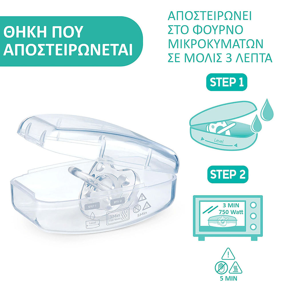 Η νέα θήκη αποστείρωσης σας επιτρέπει να απολυμαίνετε τις πιπίλες Chicco στο φούρνο μικροκυμάτων, εξαλείφοντας το 99,9% των επιβλαβών οικιακών μικροβίων μέσα σε μόλις 3 λεπτά!
