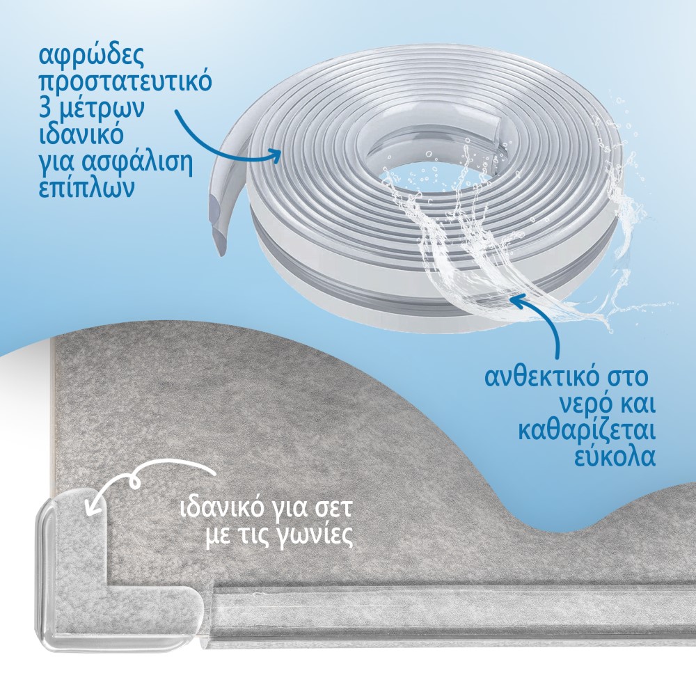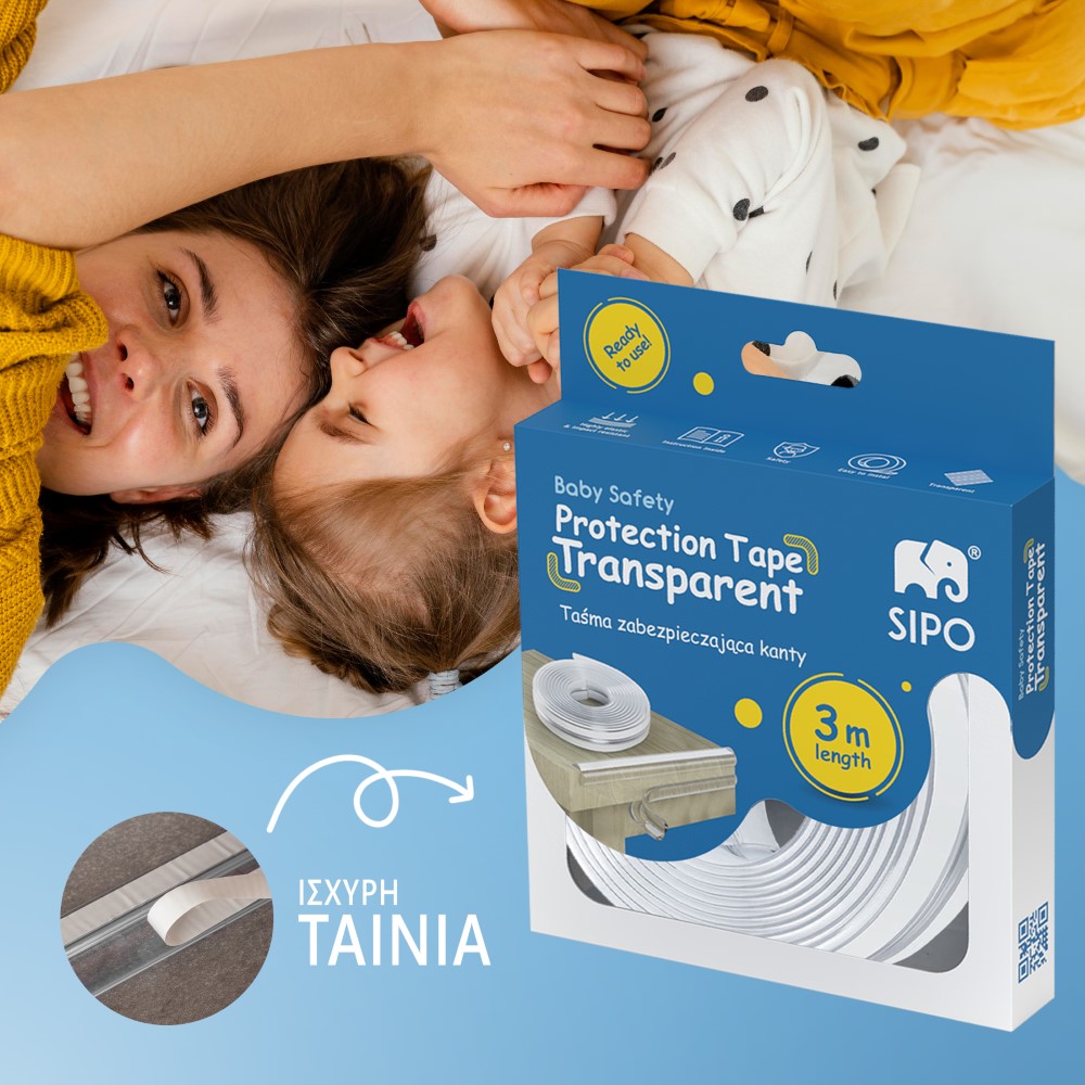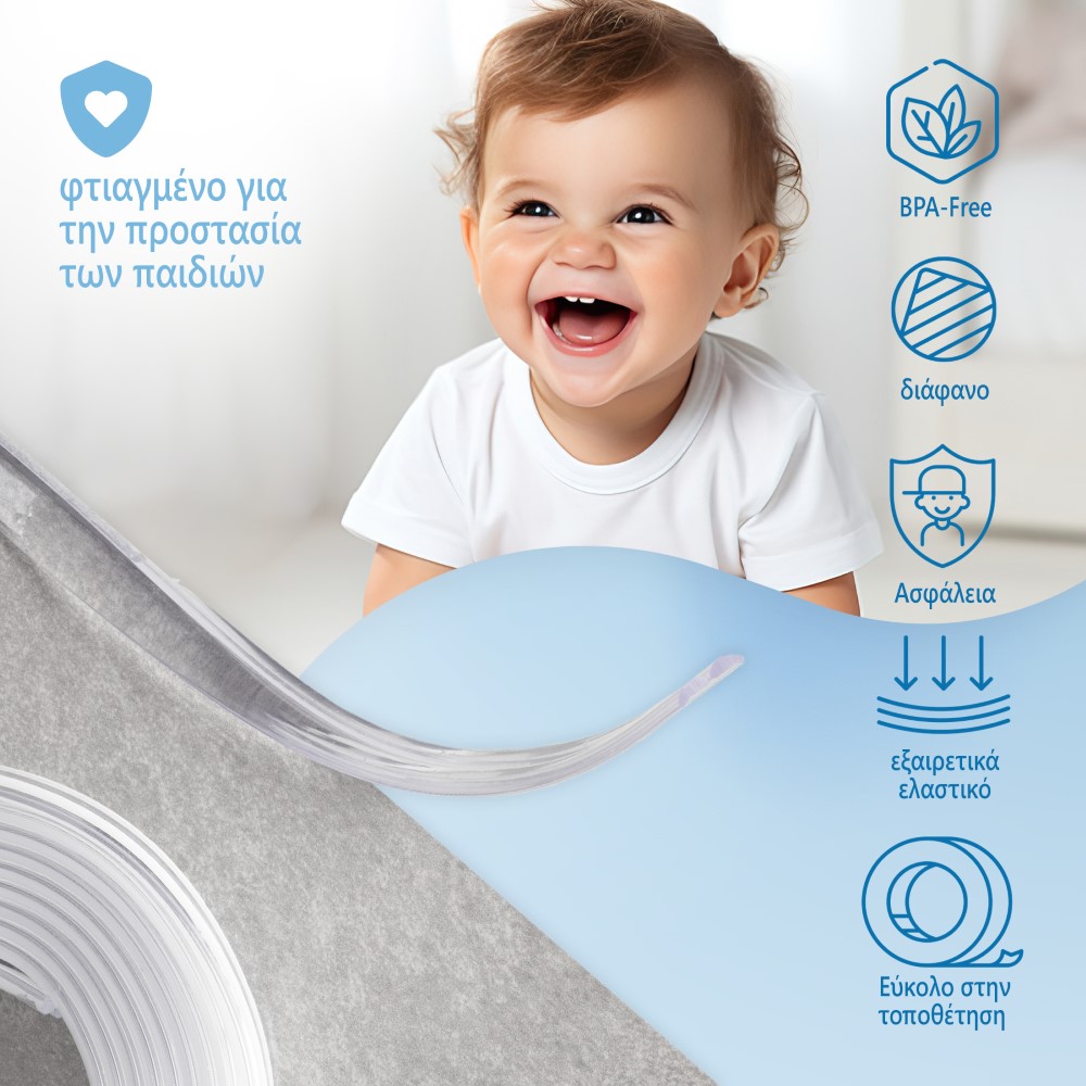 Η Προστατευτική Ταινία Επιφανειών Διάφανο/Λευκό , κατασκευασμένη από σιλικόνη ,είναι μαλακή και εύκαμπτη και σάς βοηθά να προστατεύσετε τα παιδιά σας από  τις γωνίες και τις άκρες των επίπλων και άλλων  αντικειμένων.