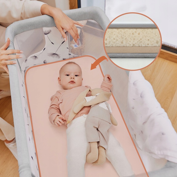 Το λίκνο διαθέτει ημίσκληρο στρώμα αφρού T25 υψηλής ποιότητας, που προσφέρει σωστή στήριξη στο σώμα του βρέφους. Η δυνατότητα ρύθμισης της κλίσης του στρώματος είναι ιδιαίτερα χρήσιμη σε περιπτώσεις αναγωγών ή ήπιων αναπνευστικών ενοχλήσεων. Το αποσπώμενο κάλυμμα τύπου peach skin είναι απαλό, φιλικό προς το ευαίσθητο βρεφικό δέρμα και εύκολο στη φροντίδα.