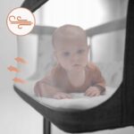 Η μεγάλη επιφάνεια αεριζόμενου πλέγματος εξασφαλίζει άριστη κυκλοφορία αέρα και συνεχή οπτική επαφή με το μωρό. Η λειτουργία λικνίσματος, με ενσωματωμένους περιοριστές για ασφαλές κούνημα, βοηθά στην ηρεμία του παιδιού, ενώ τα 4 ροδάκια με φρένα διευκολύνουν τη μετακίνηση και εξασφαλίζουν σταθερότητα.