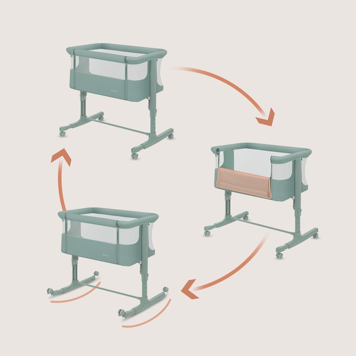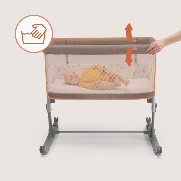 Η ομαλή ρύθμιση ύψους σε συνδυασμό με τη δυνατότητα ρύθμισης του μήκους των ποδιών επιτρέπει την εύκολη προσαρμογή του λίκνου στο ύψος του γονεϊκού κρεβατιού. Έτσι, το μωρό κοιμάται δίπλα σας με ασφάλεια, διευκολύνοντας τον νυχτερινό θηλασμό και την επαφή, χωρίς να περιορίζεται ο χώρος ύπνου των γονέων.