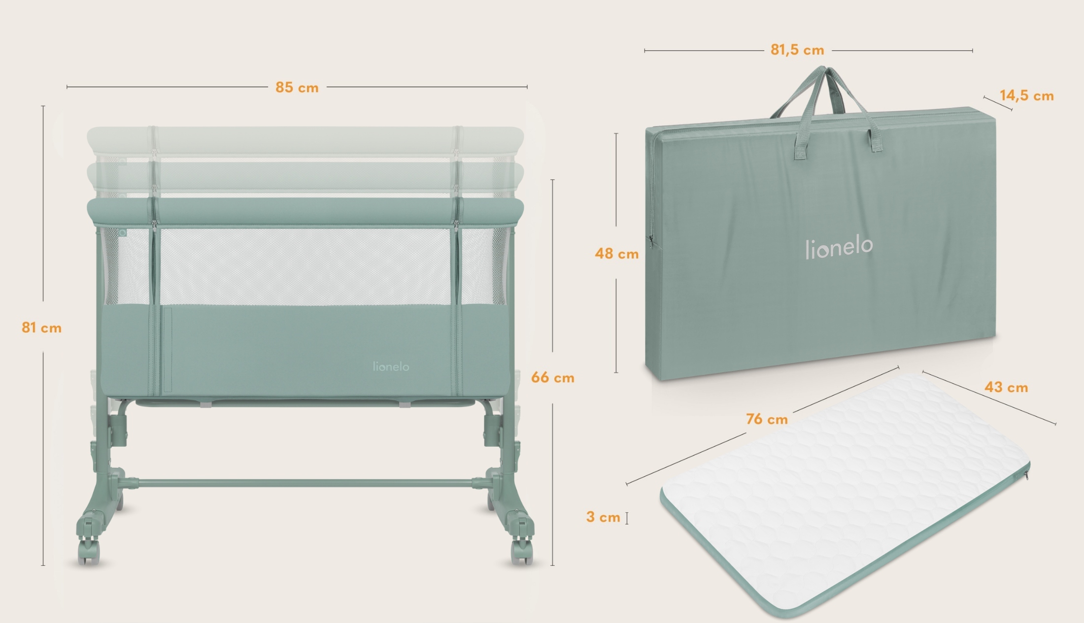 Χάρη στη συνεχή ρύθμιση ύψους και τη ρύθμιση του μήκους ποδιών, το Lionelo Aurora προσαρμόζεται εύκολα σε διαφορετικά ύψη κρεβατιών γονέων (εύρος 52–60 cm), επιτρέποντας την τέλεια εφαρμογή δίπλα στο κρεβάτι σας. Έτσι, το μωρό παραμένει πάντα κοντά σας, διατηρώντας παράλληλα άνετο και ασφαλές χώρο ύπνου για όλους.