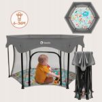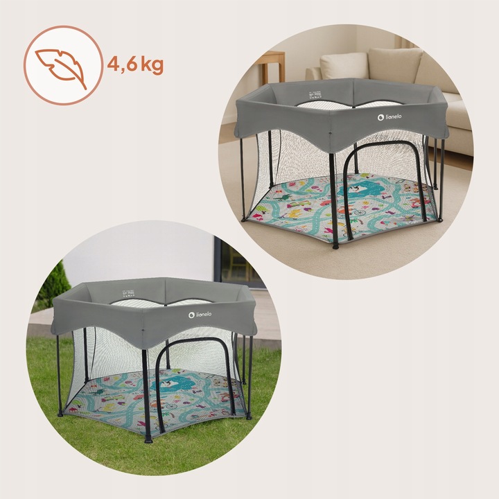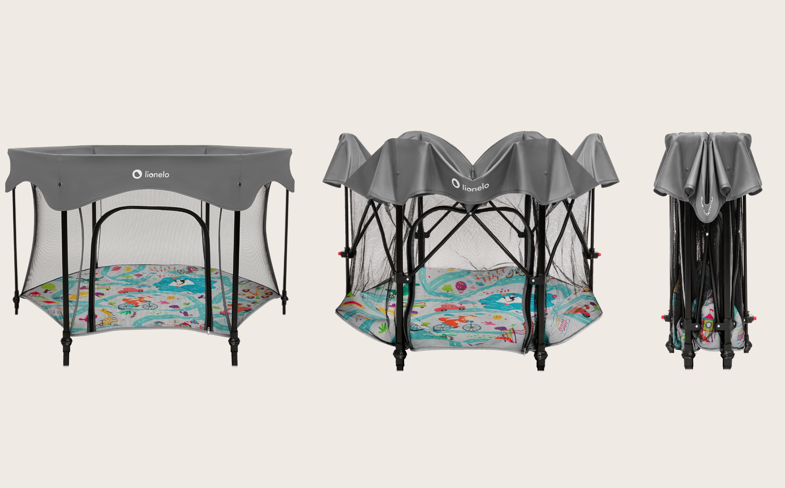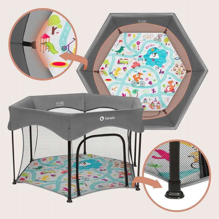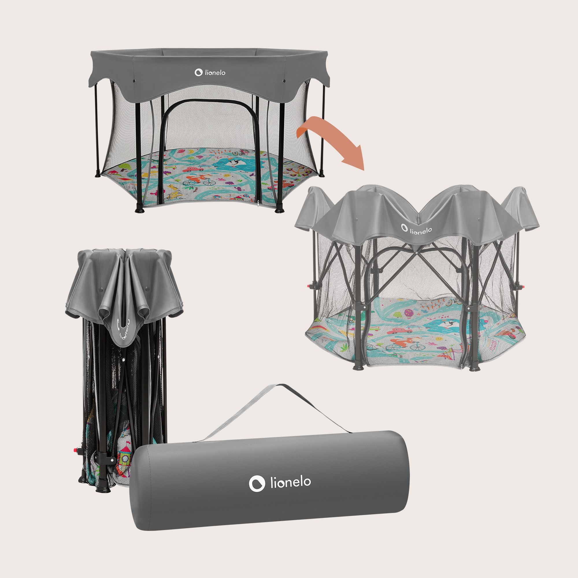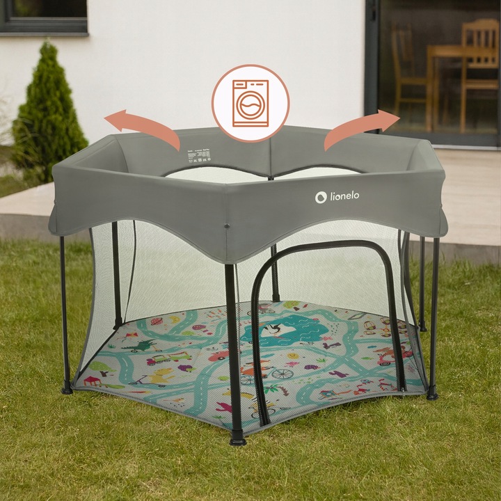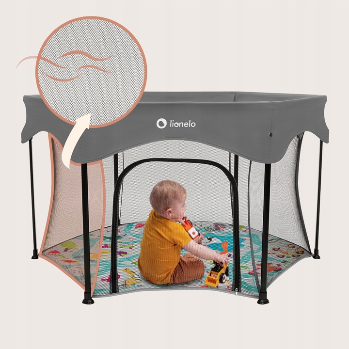 Lionelo Roel πάρκο 135×135 – πτυσσόμενο, συμπαγές, με πλαϊνή είσοδο με φερμουάρ και σύστημα ασφαλείας.