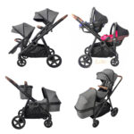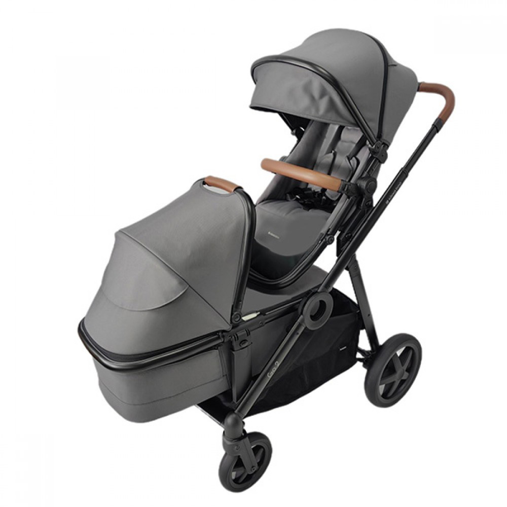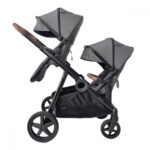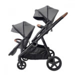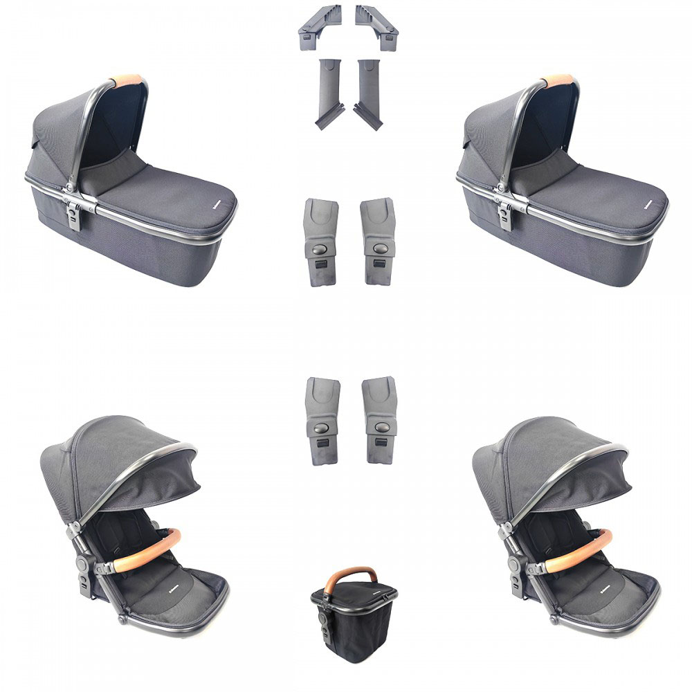 Συστήμα Μεταφοράς για δίδυμα που περιλαμβάνει τις θέσεις του καροτσιού, τα δύο πορτ μπεμπέ, τα καθίσματα αυτοκινήτου και ένα μεγάλο καλάθι αγορών που προσαρμόζεται εύκολα πάνω στο πλαίσιο.