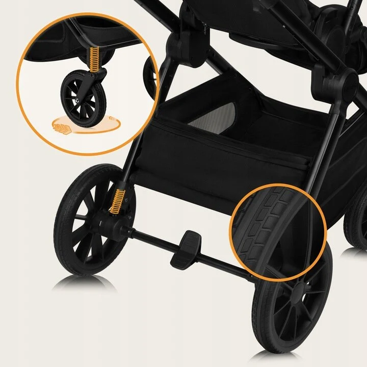 Ακόμη και οι βόλτες σε απαιτητικές, μη ασφαλτοστρωμένες επιφάνειες θα είναι άνετες χάρη στην πολύ καλή απορρόφηση κραδασμών και τους μεγάλους τροχούς από καουτσούκ παντός εδάφους (29 cm και 20 cm σε διάμετρο) με βαθύ πέλμα και πολύ καλή απορρόφηση κραδασμών. Οι μπροστινοί τροχοί είναι περιστρεφόμενοι (360°) και εγγυώνται επαρκή ευελιξία του καροτσιού.