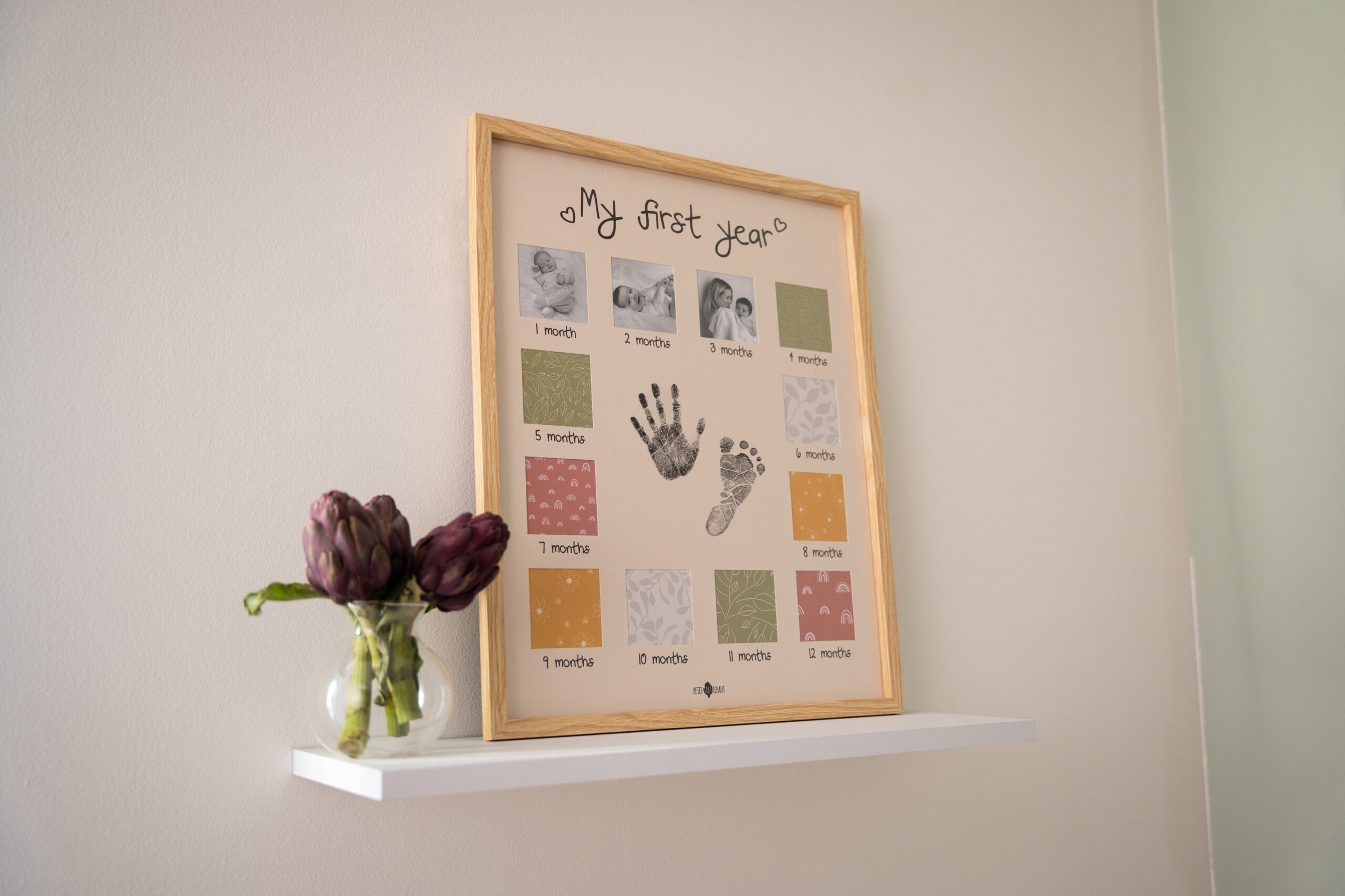 Το My First Year Frame είναι για τους γονείς που θέλουν να παρουσιάζουν με περηφάνια μια συλλογή από φωτογραφίες του μωρού τους από τον πρώτο του χρόνο μαζί με το αποτύπωμα του.