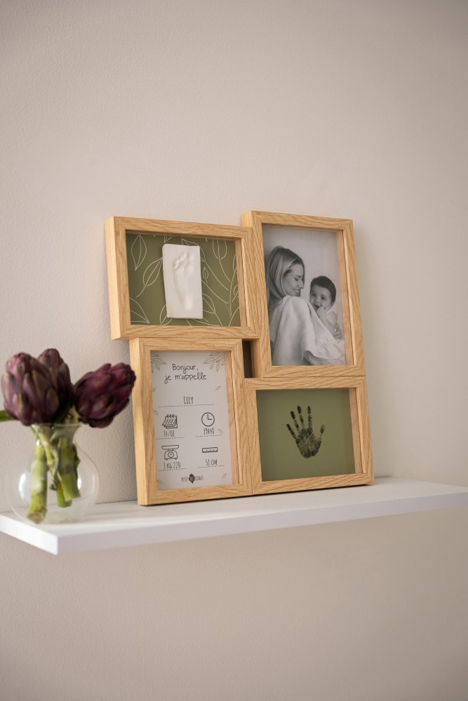 Το Puzzle Frame – Olive Tree είναι μια σύνθεση κορνιζών για την εμφάνιση της φωτογραφίας του μωρού και των αποτυπωμάτων του με πηλό και μελάνι.  Συνοδεύεται επίσης με μια αφίσα γέννησης για να γράψετε όλες τις πληροφορίες του γεγονότος: όνομα, βάρος, ύψος, καθώς και την ώρα και την ημέρα άφιξης του μωρού! Το φόντο του πλαισίου είναι δύο όψεων για να διαλέξετε το μοτίβο φυλλώματος ή μονόχρωμο πράσινο χρώμα.