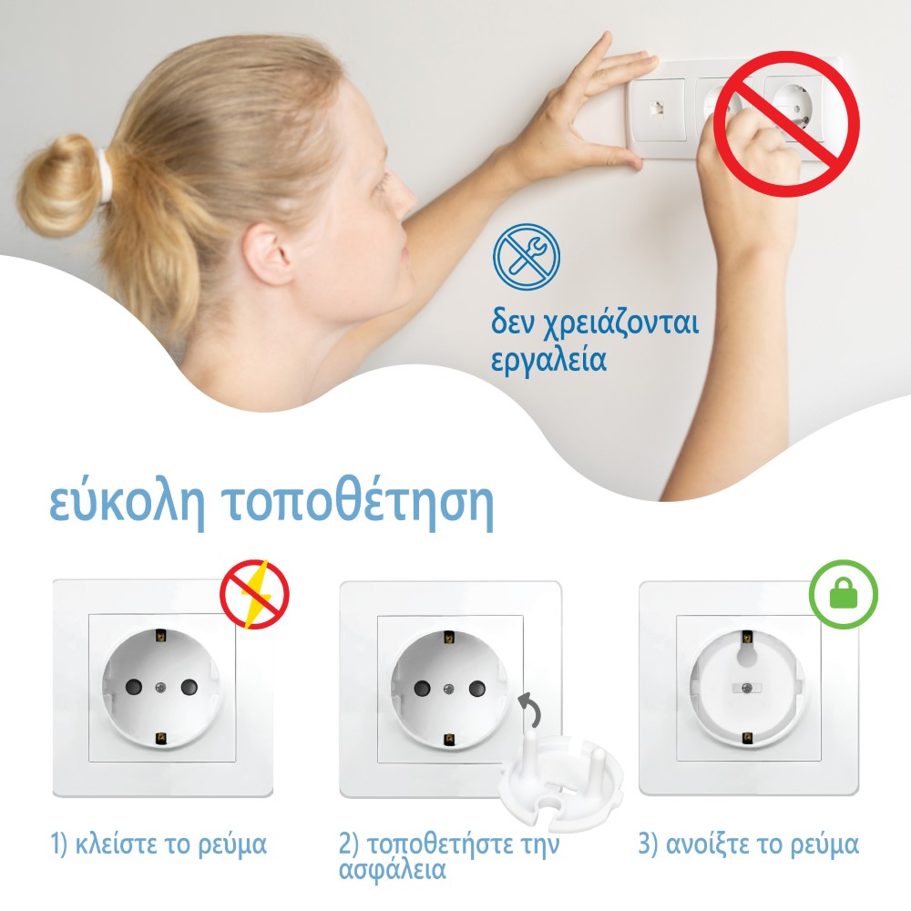 Είναι κατασκευασμένες από ανθεκτικό πλαστικό για μακροχρόνια αντοχή. Η εγκατάσταση είναι απλή και δεν απαιτεί εξειδικευμένες γνώσεις ή εργαλεία – απλώς συνδέστε τα καπάκια στις ηλεκτρικές πρίζες. Αυτό θα αποτρέψει τα παιδιά από το να αγγίξουν τα προεξέχοντα βύσματα ή να εισάγουν ξένα αντικείμενα στην πρίζα.